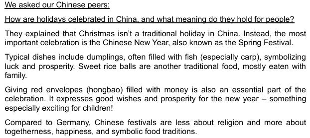 此次学习营也设置了一个研究环节,让德国学生自己选择主题对中国开展一个小型研究、写个小报告,这个报告能够反映德国学生怎么看待中国、也给中国提供看待自己的国际视角。例如德国学生比较了中德社会福利差异、节日文化差异、青少年行为模式的相似与差异等等。这个研究项目加深了德国学生对中国学生及中国文化的了解。