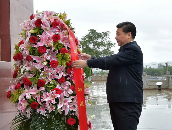2016年7月18日,习近平在宁夏固原市西吉县将台堡向红军长征会师纪念碑敬献花篮。新华社记者 李涛 摄