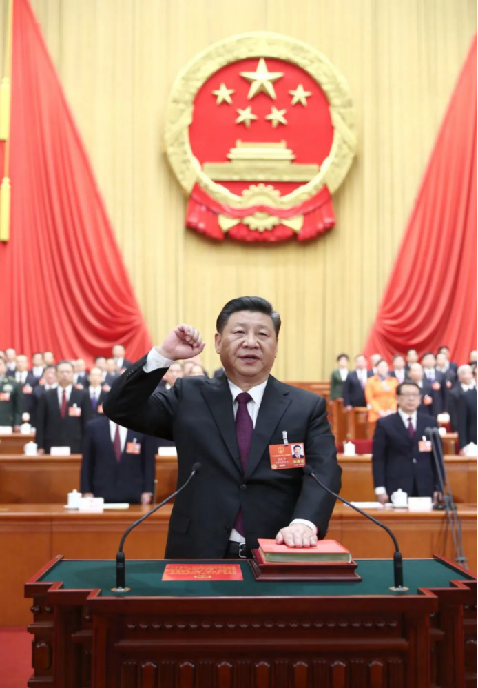 2018年3月17日,十三届全国人大一次会议在北京人民大会堂举行第五次全体会议。习近平当选中华人民共和国主席、中华人民共和国中央军事委员会主席。这是习近平进行宪法宣誓。新华社记者 鞠鹏 摄