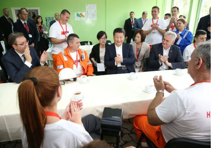 2016年6月19日,习近平在贝尔格莱德参观河钢集团塞尔维亚斯梅代雷沃钢厂时,来到员工食堂同工人交流互动。新华社记者 马占成 摄