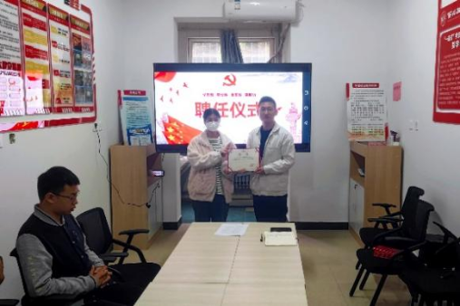 仪式第二项,秦远和刘洋为“筑梦青年”党员志愿服务队红色宣讲先锋、政策咨询先锋、普法宣传先锋、学业指导先锋、就业帮扶先锋代表颁发聘书。