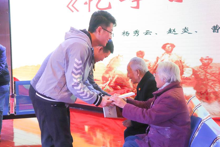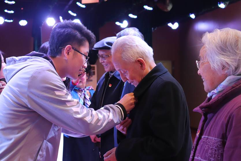 第二篇章为忆峥嵘岁月。在中国人民艰苦卓绝的革命征程中,涌现出了无数优秀共产党员,他们带着对党的忠诚、对民族的信念与对人民的责任在历史的前沿拼搏奋战。本次活动有幸邀请到了澳门威尼斯人官网 杨秀云、赵炎、曹正超和高全仁四位老党员。首先,学生代表为四位老党员佩戴了党徽,老党员以书籍回赠学生,并对新一代政法人表达了美好的期望与祝福。