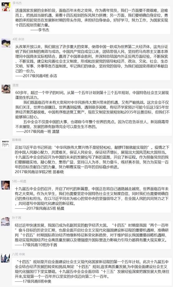 线下活动主要以团会形式举行,首先是由各班团支书介绍十九届五中全会的主要内容及精神,随后同学们踊跃参与讨论,结合疫情与当今国际社会的局势表达了对祖国的拥护与热爱,也深入探讨了十九届五中全会的规划对我国未来的重大影响。