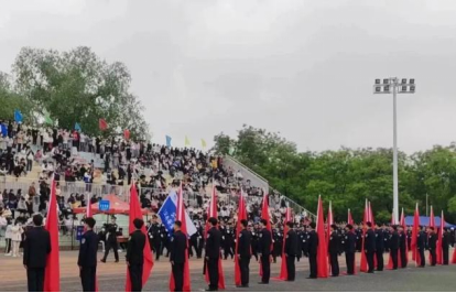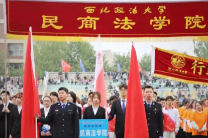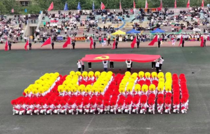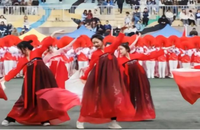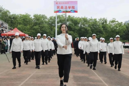 开幕式上,民商学生代表队伍与教师队伍步调铿锵,精神焕发,五色翻花花浪阵阵,蓬勃朝气与沉静稳重碰撞出精彩火花。大型团体操表演《领航》中,奔跑的红色身影点燃在茵茵球场,于音乐声响下,花色转动间,拼合成无数图案,歌颂光辉岁月,礼赞美丽中国。这整齐划一的动作背后,凝聚的是一个月辛苦训练里的汗水与辛劳,复杂变幻的队形之中,蕴藏的是民商学子团结奋发的精神品格。