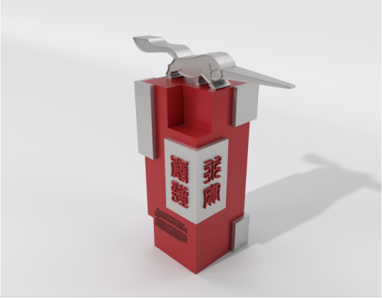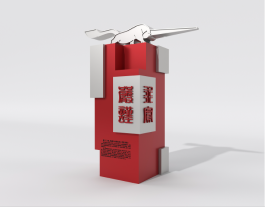 雕塑以抽象手法提取獬豸造型经典元素,尺寸以原件尺寸为基础放大一倍,造型雄健有力,威武勇猛,具有汉代艺术的豪放大气风格;独角夸张锐利,四足前后蹬直,尾部高举,浑身彰显着动感和力度。雕塑基座选取以印章形式展现澳门威尼斯人官网