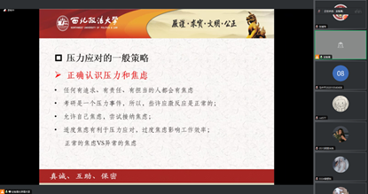 赵智勇副教授围绕考研备考期间的压力成因、潜在心理问题、压力应对策略等方面展开讲解。他指出了备考过程中可能出现的心理问题比如焦虑、失眠、自我怀疑及其产生原因。他强调,面临压力是备考期间的正常现象,同学们应该增强自信心,运用积极的自我暗示,来达到减压增效的效果。对讲座时同学们提出的如何以良好的状态备考的问题,赵智勇副教授指出,同学们要学会利用“上、下、不、动、静”睡眠五字诀,养成规律高效的睡眠习惯,并通过运动调节不良情绪,始终保持信心积极备考。