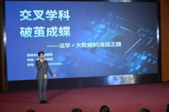 4号唐景霖以“交叉学科,破茧成蝶”为主体,讲述自己从法学学子到建模专家,将想法变现为全国十佳模型的历程。他围绕恶性校车问题进行算法研究,建立的模型不仅斩获多个奖项,且在全国推广应用,得到最高检的高度评价。同时,他以数字法学为基点,结合建模经验与其他部门法,参与了多项课题研究。在科研之路上,唐景霖坚守初心,扎根基层服务,瞄准社会问题,助力谱写新时代法学青年的时代篇章。