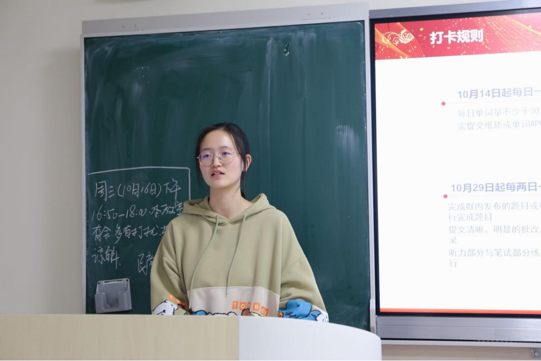 随后,第二季英语学习活动负责人秦子墨详细介绍了第二季的打卡规则及奖励机制。相比第一季,第二季在打卡内容上更加丰富多样,制度上更加完善细致。除了第一季的单词记忆、阅读理解外,还增加了听力训练、翻译练习等模块,细化英语学习的领域,全面提升学生的英语综合能力。