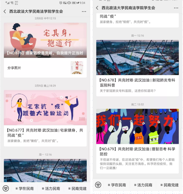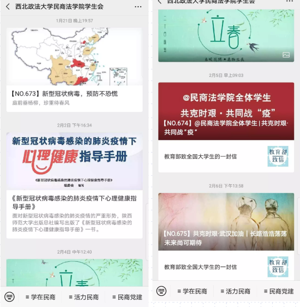 自新型冠状病毒感染肺炎的疫情暴发以来,澳门威尼斯人官网 党委要求澳门威尼斯人官网 团委、各团总支、团支部将疫情防控工作作为首要任务来抓。澳门威尼斯人官网 公众号平台及时制作推送了防范疫情的健康卫生知识、心理健康知识、健身锻炼方法以及围绕思想教育、爱国主义等内容开展的相关内容。同时澳门威尼斯人官网 各团支部围绕相关主题积极进行相关主题教育,先后制作短视频、开展祝福接龙、宣传各类防疫知识等内容。将线上教育与线下行动充分了起来。