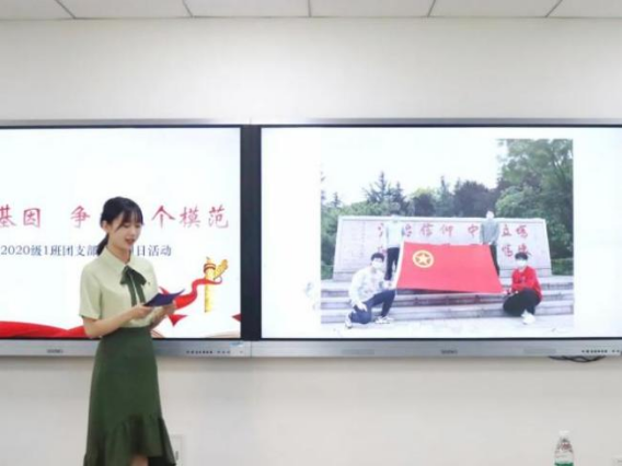 在第四个环节“团支部书记讲微团课”中,曹雨璇同学通过讲解张太雷同志的先进事迹,与大家分享了应当如何做一名优秀的共青团员。通过学习体悟革命先烈的崇高精神,同学们纷纷表示要从先辈英勇事迹中汲取力量,积极传承红色基因,内化于心,外化于行,争做五个模范。