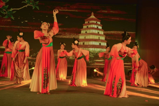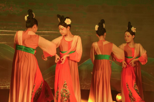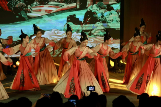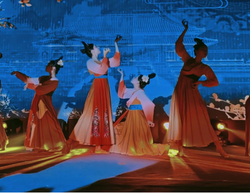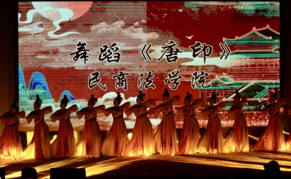 我院李依璇等人带来的舞蹈《唐印》将观众们的思绪拉回大唐。“黄金锦缎阊阖入,振彻车轴响九苍。唐韵点烛徵曲唱,霓裳清卷淡墨香。”静谧的博物馆中,唐三彩仕女俑在夜色中悄然复苏,缓缓舒展自己的身体,同时盛唐时期的记忆也一点点回到脑海中,历经千年风霜,身躯和记忆都变得斑驳陆离,然而随着苏醒,她们的色彩又逐渐恢复昔日的鲜艳,带领我们一同穿越时空,回到大唐最鼎盛的时期,一窥大唐奔放瑰丽的历史风貌。舞者玉肌伴清风,靥笑春桃兮,慢垂霞袖,婀娜多姿,飘逸灵动,生动演绎了大唐盛世的盛兴与衰亡,极具历史文化感,《唐印》荣获本次舞蹈比赛的一等奖。舞台上的完美呈现是台下每个舞蹈演员呕心沥血的成果,她们在练习室里挥汗如雨,身体疲软却仍坚持排练,最终给在舞台上为我们展现了这支美若惊鸿的《唐印》。