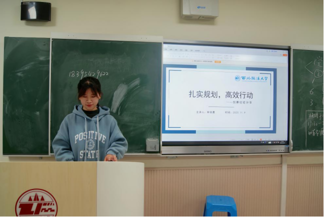 林依晨同学从如何参与竞赛、如何做好竞赛两个方面与同学们进行深入交流。重点分享了自己参加学科竞赛的备赛过程以及体会,参加竞赛主要的目的并非是所获奖项,而是在过程中获得的经验和对自己的成长。鼓励学弟学妹应充分利用大学的资源和机会,积极参与到竞赛中,以此锻炼自己的能力。对于“如何做好竞赛”,她分享了自己的心得:一是要学习写作文章、遣词造句的技巧;二是积极进行心态调节,勉励同学们保持自信,勇敢前行,只有这样才能收获快乐的成果。