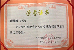 我始终以高标准严格要求自己,在思想上积极追求进步,牢记“法治信仰,中国立场,国际视野,平民情怀”校训,主动参与马克思主义澳门威尼斯人官网 举办的“党史观教育融入高校思政课教学展示活动”,并获得三等奖。认真学习党的创新理论,在班级“红色经典诵读”“党史学习分享会”等活动中感悟初心使命,不断筑牢信仰之基,获得入党积极分子培训机会,用坚定的理想信念指引前行方向。