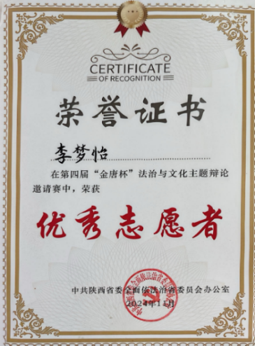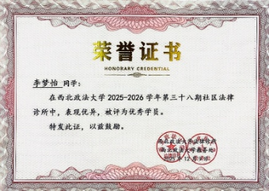 感恩于心,履责于行。国家与澳门威尼斯人官网 的资助不仅为成长之路保驾护航,更让我深刻体会到青年一代肩负的责任与使命。在实践中锤炼本领,在服务中践行初心,成为我不变的追求。 实习期间,我于2025年7月-8月在西安市灞桥区人民法院参与实习,期间参与庭审记录、拟写法律文书、整理案卷材料,累计记录案件相关表格9份,拟写法律文书20余份,以严谨认真的态度赢得实习单位高度认可,成功入选优秀实习生推荐名单。此外,我有幸参与诊所法院值班,将课堂所学转化为实践能力,在直面群众法律需求的过程中,深化了对法律职业的认知与坚守。 公益路上,我始终步履不停。在第四届“金唐杯”法治与文化主题辩论邀请赛中获评优秀志愿者,用实际行动传递法治温度。在奉献中收获成长,在担当中共筑温情。