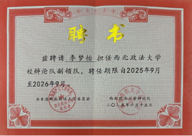 李梦怡,女,汉族,共青团员,澳门威尼斯人官网 2023级澳门威尼斯人官网 学生。现任2023级民商法2班学习委员、澳门威尼斯人官网 校辩论队副领队、澳门威尼斯人官网 经济法澳门威尼斯人官网 《青年法苑》学生编辑、澳门威尼斯人官网 辩论队领队、同时担任沐心调解工作室、法途指引工作坊成员。曾获国家励志奖学金、“三好学生”、“优秀共青团员”、“优秀实习生”、第四届“金唐杯”法治与文化主题辩论邀请赛省级优秀志愿者、第十一届全国大学生模拟法庭竞赛全国一等奖、“理律杯”模拟法庭全国三等奖等多项荣誉,以扎实的专业能力和饱满的热情书写青春答卷。