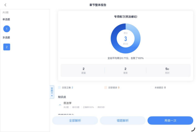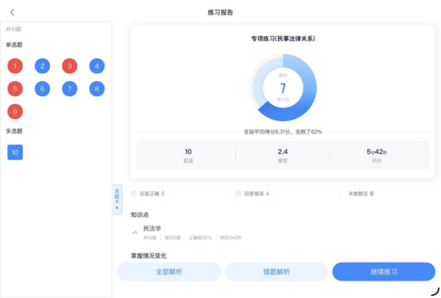 学习心得:这两日学习了民法概论与民法基本原则两大模块,系统梳理了民法的调整对象、调整方法、性质、渊源,以及民法基本原则等基础知识。完成了“民法绪论”和“民事法律关系”两组专项练习,正确率尚可,但对复杂法律关系的构成要素及适用条件的理解仍然不够深入。后续我将针对错题进行专项复盘,结合教材重新梳理知识点逻辑。