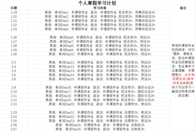 目标:制定寒假学习任务,以便适应考研备考阶段,在此期间完成考研英语单词背诵、考研真题刷题、复习一遍考研政治的五本教材,并完成目标院校专业课学习,为后期背诵奠定良好的基础,目前以理解为主。上面附上假期学习计划打卡表。