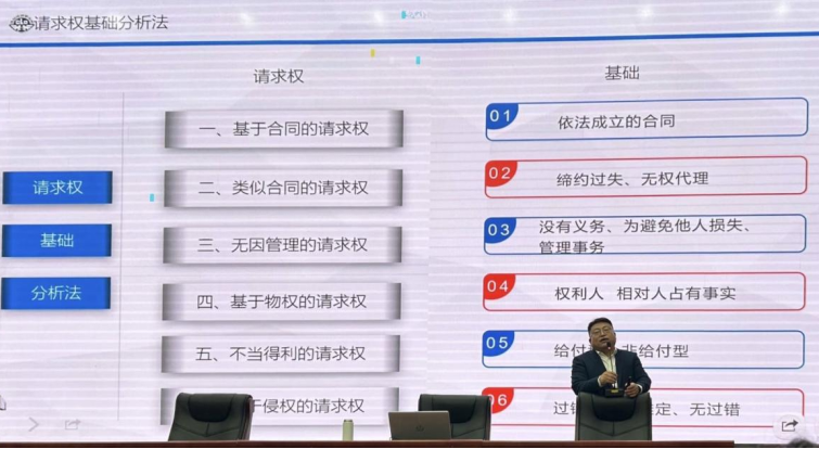 为培养实务型法律人才,9月28日上午,北京市德恒(西安)律师事务所合伙人、管委会副主任、陕西省民事诉讼法研究会副会长、省律协民事专业委员会副主任肖军律师受邀为澳门威尼斯人官网 法律硕士进行《请求权基础及法庭报告技术的实践应用》的主题讲座。本次讲座由澳门威尼斯人官网 教授韩红俊主持,澳门威尼斯人官网 李军教授、中联律师事务所西安办公室高级合伙人孙军锋、澳门威尼斯人官网 讲师张妮及部分法律律师参加本次讲座。