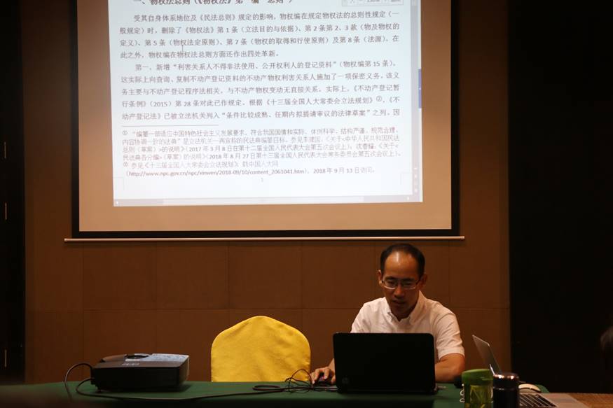 接着由朱广新教授发表了题为“从物权法到物权编:革新发生在哪里——《民法典物权编(草案)》评析之一的发言,讲解了《民法典物权编(草案)》较之于《物权法》的革新方面,而最大的革新在于“把居住权规定为一种新的用益物权类型。除此之外的其他立法革新或改变,主要表现为对一些章节中个别法律条文的零零星星的修改或增补。以章为单元看,除宅基地使用权、地役权、担保物权一般规定、留置权、占有等部分未发生丝毫变化外,其他章节都发生了或多或少的修改、删节或补充。”