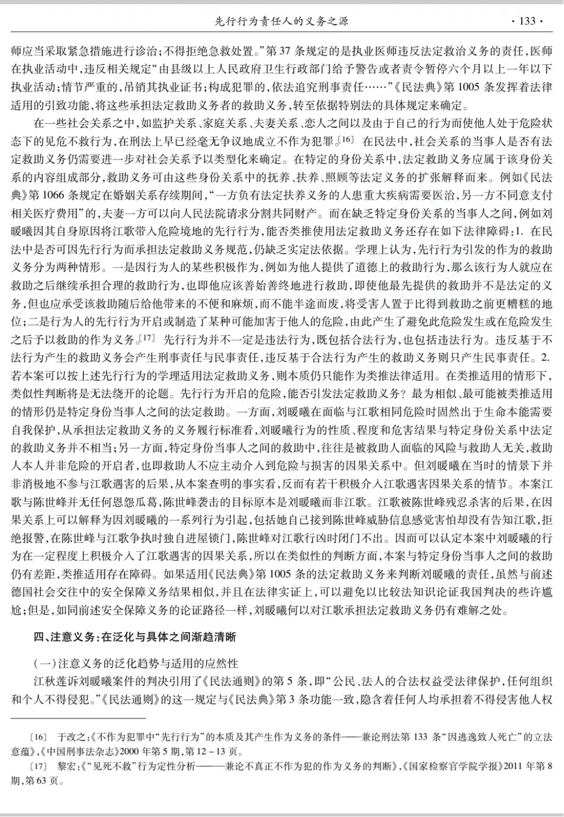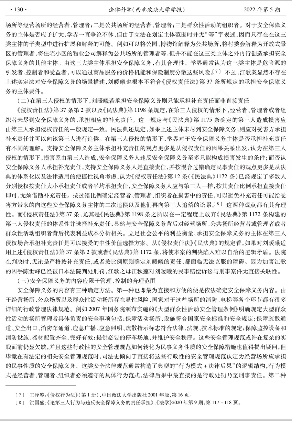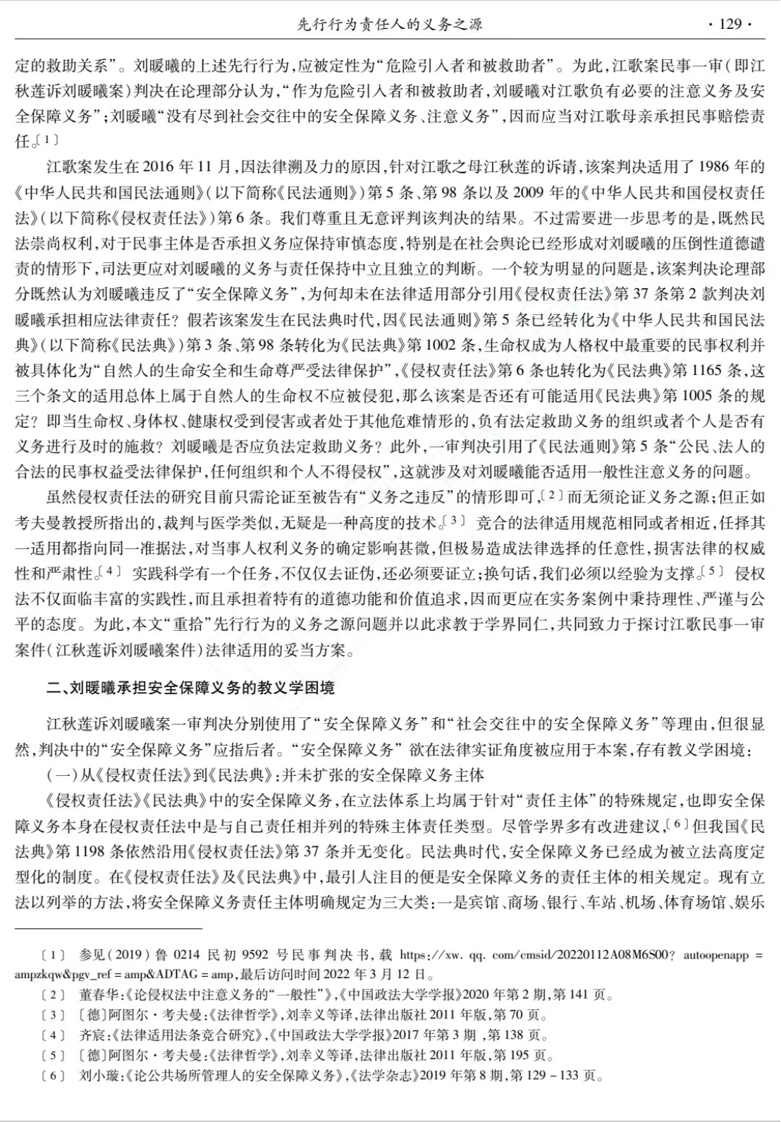 程淑娟老师的这篇论文发表于《法律科学》2022年第5期,以江歌案民事一审判决为主要考察对象介绍了先行行为责任人的义务之源。