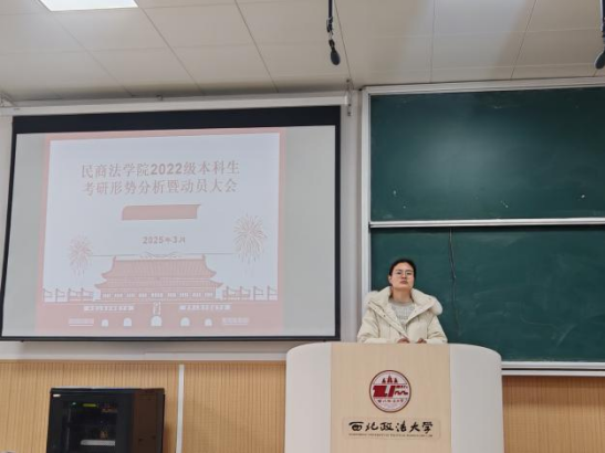 近年考研形势,建议同学们结合自身兴趣与能力,提早规划、理性选择、努力备考。随后,杨老师从多个角度分析了当今就业形势,为同学们阐述了法学生未来就业发展方向及各行业发展前景,建议同学们要加强专业能力修养,对标职业目标不断提升自身综合能力。