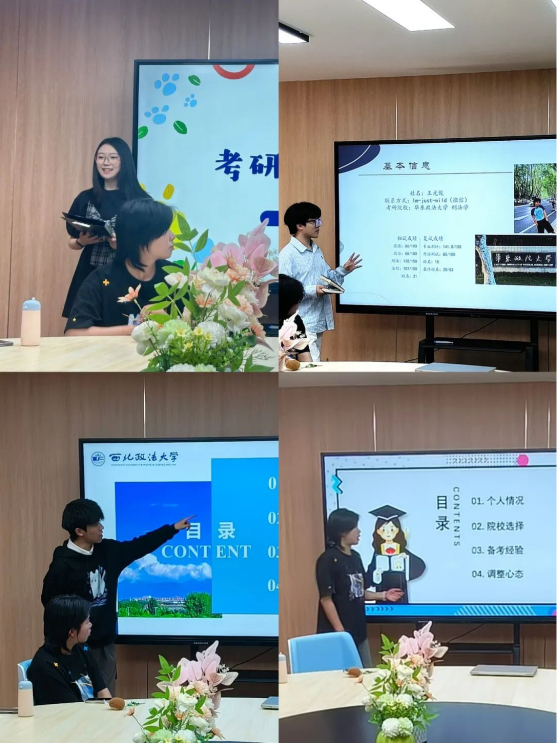 自由交流环节,同学们就“如何平衡法考与考研”“焦虑情绪调节”等问题踊跃提问。主讲人们结合自身考研经历,强调“以目标为导向,化压力为行动力”,并建议通过运动、社交等方式适度放松,保持积极心态。