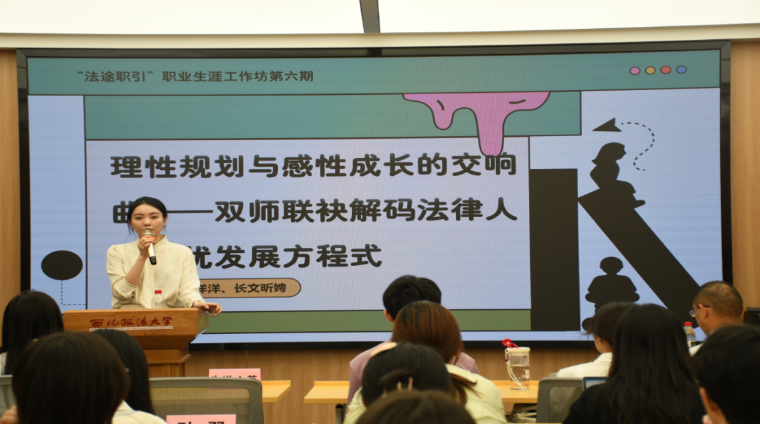 长文昕娉老师则聚焦“法学生内在力量的觉醒与续航”,深度剖析法律人在成长过程中的心理建设与自我驱动。她对在座同学提出三点建议:一是要合理选择,在充分了解自己的性格的前提下,选择适合自己的道路与职业;二是要坚定自己的道路,充分相信自己的决定,不被外界的声音所干扰;三是要努力学习,在学习的过程中不断充实自己,提升各方面能力,最终实现个人的成功。