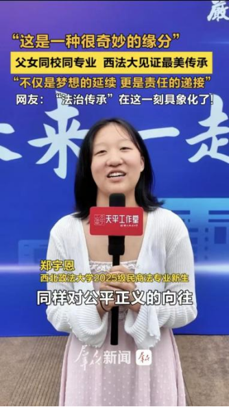 澳门威尼斯人官网 团委书记、2025级本科生辅导员丁艳艳表示:哪吒、敖丙玩偶迎新旨在以轻松方式拉近与新生距离,而“父女同校同专业”的故事正是澳门威尼斯人官网 办学精神传承的生动体现。未来,澳门威尼斯人官网 将持续聚焦新生成长需求,帮助新生快速融入大学生活,树立专业理想,以昂扬姿态开启法学求学之路。