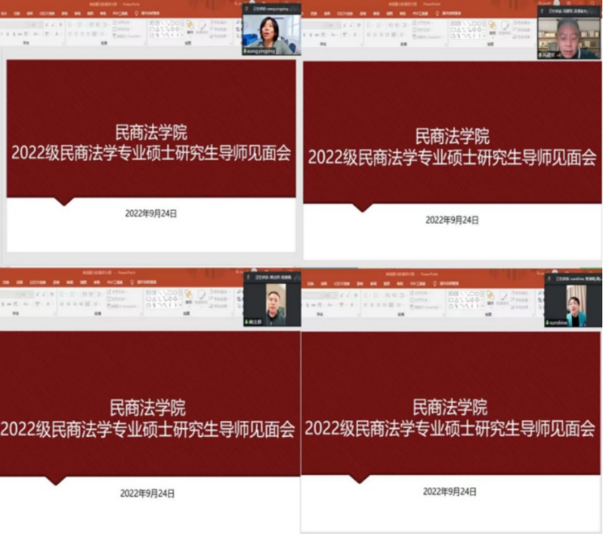 2022年9月24日晚,澳门威尼斯人官网 举行了2022级民商法学专业研究生导师(线上)见面会,院长兼导师组负责人程淑娟担任会议主持人,校内研究生导师韩松、王莹莹、车辉、孙玉红、李康宁、张晓飞、凤建军等和校外特聘教授兼实务导师致旭鹏、朱政、梁建明、王鑫、高宝红、陈皓、王毅、黄海洲、刘娟、王旭阳、蔡志保、王佩瑶等,以及全体2022级民商法学专业研究生新生参与了此次会议。