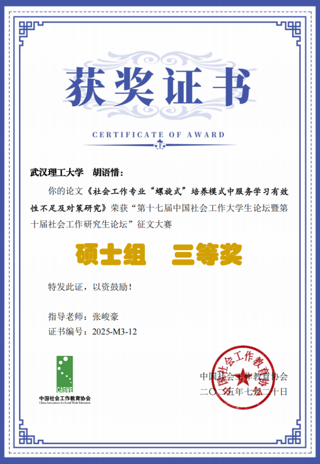 会议组委会在评审意见中指出,该论文选题切合社会工作教育发展需求,研究视角具有一定创新性,提出的建议对专业教育改革具有参考价值。经评审,论文最终获得硕士组三等奖。