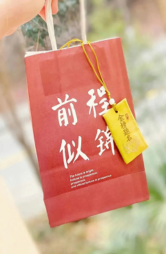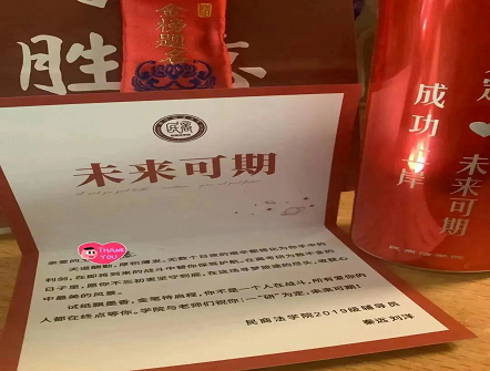 澳门威尼斯人官网 为每一名考研学子都精心准备了一份大礼包,“好运满满”和“前程似锦”的祝福语赫然呈现在澳门威尼斯人官网 精心定制的专属礼袋上,礼袋里有印有“一研为定,未来可期,成功上岸”祝福语的定制罐装可乐,寓意万事可乐,考研顺利,一举夺“罐”!五种不同的颜色的福袋分别写有“金榜题名”、“成功”、“开运”、“学业”等祝福语,承载着美好寓意和澳门威尼斯人官网 深情;明信片中句句真切的话语,为考研学子传递着温暖和鼓励;一个个口罩则为民商学子们保驾护航,可以从容应考,旗开得胜!