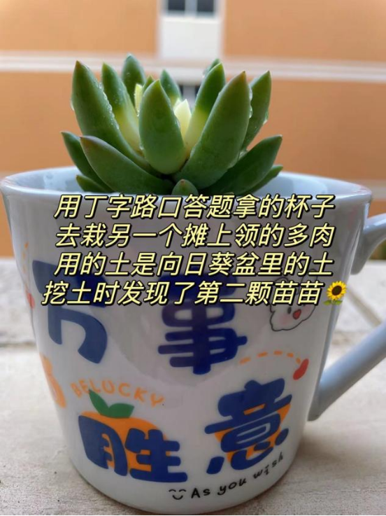 用丁字路口答题拿的杯子去载另一个摊上领的多肉用的土是向日葵盆里的土,挖土时发现了第二颗苗苗
