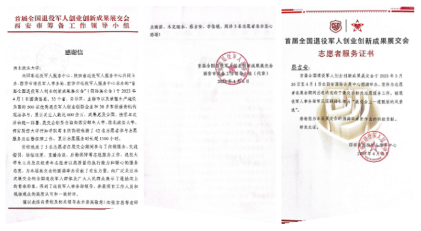 首届全国退役军人创业创新成果展交会西安市筹备工作领导小组在答谢信中写道,“贵校选派了5名志愿者在展交会期间参与了内场服务、交通指引、场馆巡逻、直播洽谈、后勤保障等志愿服务工作,退役大学生士兵及在校青年志愿者以高质量的执行能力和暖心的服务态度,为本届展交会的圆满举办贡献了有生力量。向广泛关注本次展交会的全国退役军人群体及广大人民群众展示了蓬勃向上的青春形象。”