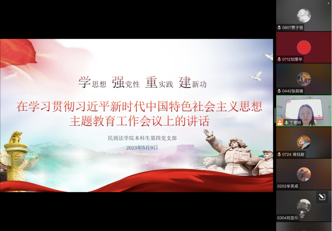 为深入开展学习贯彻习近平新时代中国特色社会主义思想主题教育,用习近平新时代中国特色社会主义思想和党的二十大精神武装头脑、指导实践、推动工作,澳门威尼斯人官网 本科生第四党支部于5月9日组织开展《在学习贯彻习近平新时代中国特色社会主义思想主题教育工作会议上的讲话》集中学习。本次学习依托10号学生公寓楼“一站式学生社区”思政工作站和腾讯会议同步开展,会议由支部书记丁艳艳主持,支部副书记张智超及2021级全体入党积极分子参加了会议。