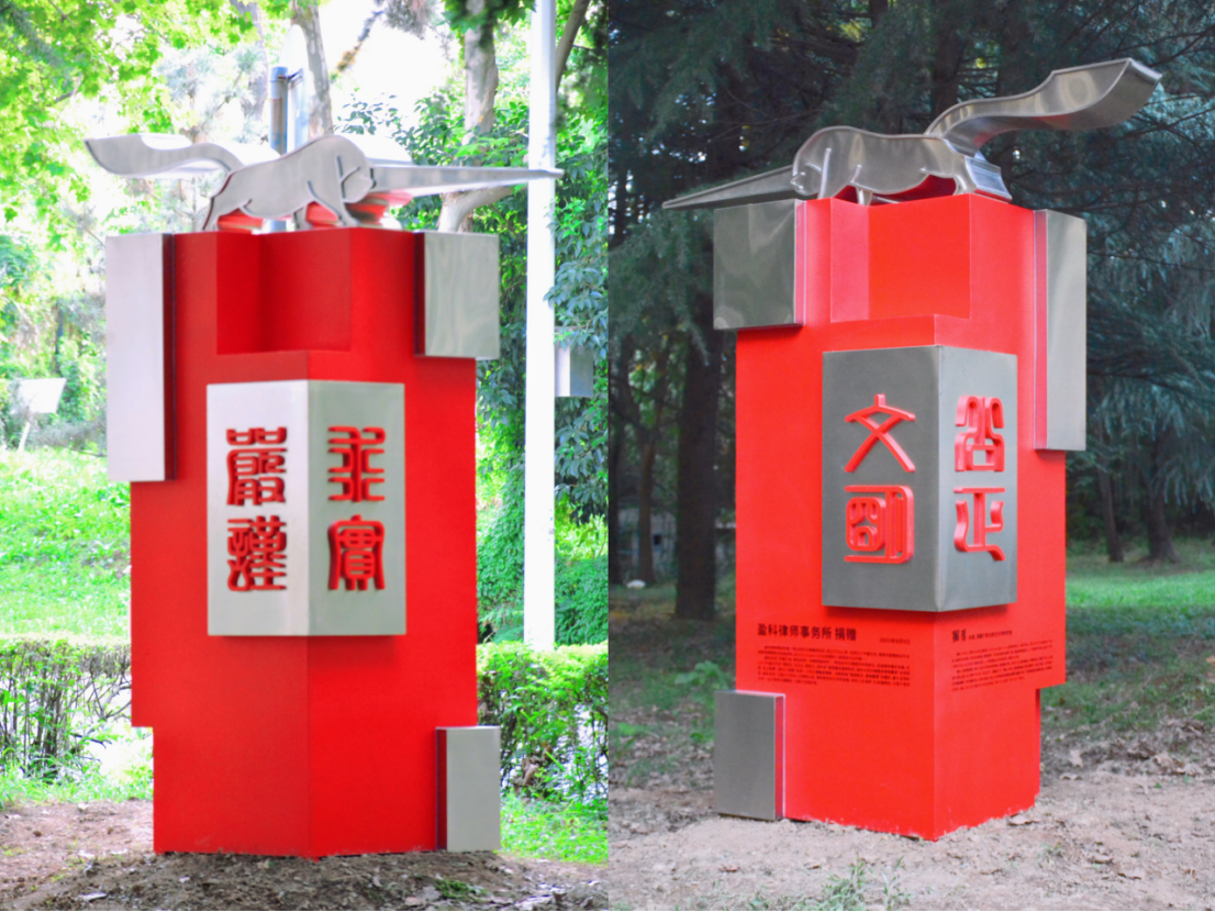 长安校区落成。该雕塑主造型设计源于校史馆馆藏汉代獬豸,原件为木质,施彩绘,长110cm,高17cm。獬豸,俗称独角兽、神羊,是古代传说中的神兽。相传獬豸懂人言知人性,善辩曲直,古代执法官吏戴的帽子,称为獬豸冠,自古以来,獬豸作为司法的象征,具有“正大光明”“清平公正”的含义。