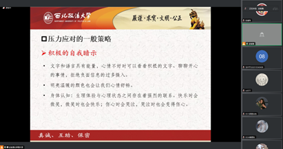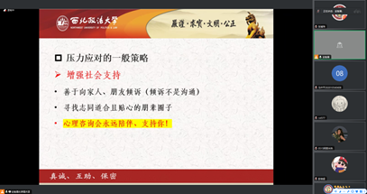 赵智勇副教授围绕考研备考期间的压力成因、潜在心理问题、压力应对策略等方面展开讲解。他指出了备考过程中可能出现的心理问题比如焦虑、失眠、自我怀疑及其产生原因。他强调,面临压力是备考期间的正常现象,同学们应该增强自信心,运用积极的自我暗示,来达到减压增效的效果。对讲座时同学们提出的如何以良好的状态备考的问题,赵智勇副教授指出,同学们要学会利用“上、下、不、动、静”睡眠五字诀,养成规律高效的睡眠习惯,并通过运动调节不良情绪,始终保持信心积极备考。