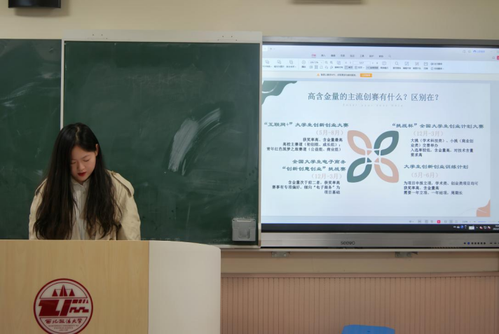 戴彧同学结合个人参赛经历,立足项目选题、团队组建、资源统筹、策划书撰写及路演技巧等关键问题进行了经验分享。她表示同学们要牢牢立足于时代,积极寻找社会热点话题,充分分析市场环境,打造新颖的设计理念,凸显自身特色,避免千篇一律格式化的产出;要广泛获取各类平台上的相关数据,积极推进项目落地实施,切勿“纸上谈兵”。最后,戴彧认为备赛过程不是一帆风顺的,成果的获取也并非一蹴而就,希望同学们可以在赛程中树立信心,坚定目标,不断从失败中总结经验,从阶段性成果中汲取前行的动力。