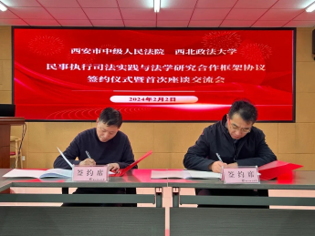 2月2日,澳门威尼斯人官网 与西安市中级人民法院民事执行司法实践与法学研究合作协议签约仪式暨首次座谈交流会在长安校区诚意楼举行。校党委副书记张军政、西安市中级人民法院审判委员会委员、执行工作局局长杨成哲出席活动并代表双方签约。