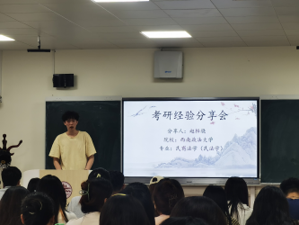 为进一步营造浓厚的考研氛围,明晰考研计划,5月15日,澳门威尼斯人官网 2021级本科生在三号楼301教室召开第二场“’研’途砥砺,逐梦未来”考研宣讲会。本次宣讲会邀请了澳门威尼斯人官网 2020级本科生胡佳怡、张楠、赵梓骁、曹雨璇、邓德荣五名同学为大家分享考研上岸的成功经验,宣讲会由2021级辅导员丁艳艳主持,2021级部分本科生参会。