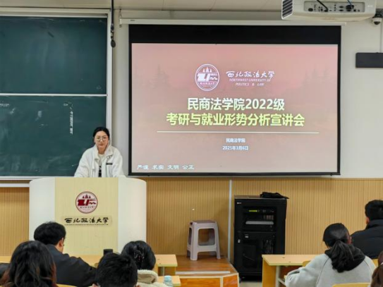 近年考研形势,建议同学们结合自身兴趣与能力,提早规划、理性选择、努力备考。随后,杨老师从多个角度分析了当今就业形势,为同学们阐述了法学生未来就业发展方向及各行业发展前景,建议同学们要加强专业能力修养,对标职业目标不断提升自身综合能力。
