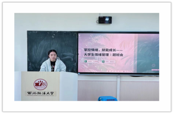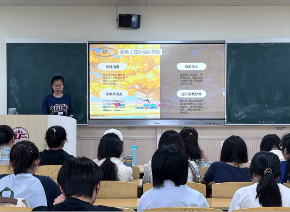 各班心理委员围绕情绪管理、恋爱成长、人际交往、学业及生涯发展任一主题作详细分享,指出:情绪是本能反应,关键在于主动管理而非被控制;恋爱与人际交往需建立健康关系,在正向互动中成长;学业及生涯规划应避免焦虑,通过制定短长期目标、按能力稳步推进来实现理想。