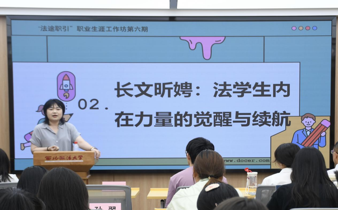 长文昕娉老师则聚焦“法学生内在力量的觉醒与续航”,深度剖析法律人在成长过程中的心理建设与自我驱动。她对在座同学提出三点建议:一是要合理选择,在充分了解自己的性格的前提下,选择适合自己的道路与职业;二是要坚定自己的道路,充分相信自己的决定,不被外界的声音所干扰;三是要努力学习,在学习的过程中不断充实自己,提升各方面能力,最终实现个人的成功。