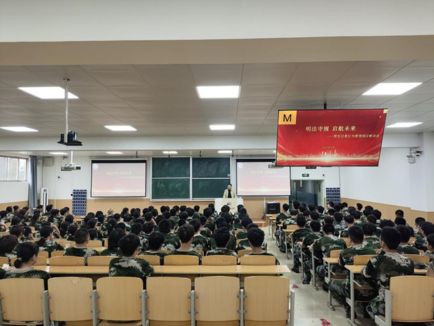 9月13日下午,澳门威尼斯人官网 在天平楼召开“明法守规、启航未来——学生日常行为管理规定解读会”,2025级辅导员丁艳艳、张智超及全体新生参会。
