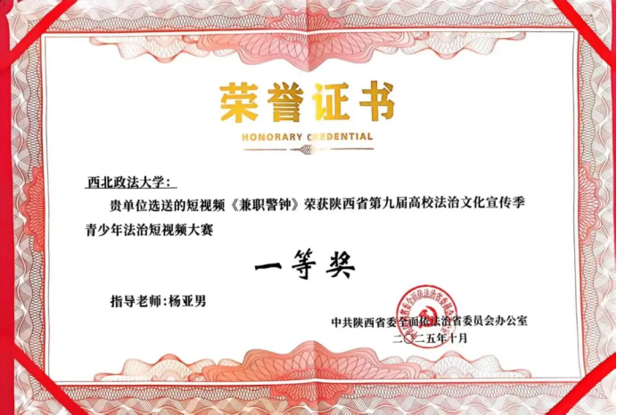 参赛作品《兼职警钟》从大学生的生活日常出发,主人公因为自己的不合理消费行为,手头拮据,意外看到了隐藏在兼职群中的犯罪分子的“兼职”消息,在高额回报的诱惑下,她还是一步步走向了陷阱。该作品既传递了"学法辨是非,用法护权益"的法治理念,也展现了新时代法学青年立足专业、服务生活的责任担当。郭赵阳,彭汇迪,李奕霖,王晨阳,张佳和,任家乐几位同学用心打磨剧本,在杨亚男老师的指导下从脚本构思到镜头拍摄,从素材剪辑到细节打磨,他们凭借扎实的专业功底、创新的表达思路和精益求精的创作态度,独立完成全流程创作,最终以兼具专业性与传播力的作品赢得评委一致认可。
