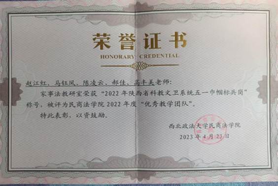 家事法教研室党支部依托澳门威尼斯人官网 家事法教研室组建成立,是澳门威尼斯人官网 首个师生共建型党支部。2018年,支部被评为陕西省巾帼英雄集体;2022年,家事法教研室荣获陕西省教科文卫系统五一巾帼标兵岗荣誉称号;2022年、2023年,被评为优秀党支部。2022年,支部党员教师陈凌云获得澳门威尼斯人官网 青年教学名师称号;2024年,支部党员教师郝佳荣获西安市三八红旗手称号。近年来,支部党员教师主持并完成国家社科基金4项,获得省部级教学科研奖6项,发表核心期刊论文20余篇,指导学生参加全国各级竞赛获奖10余项。