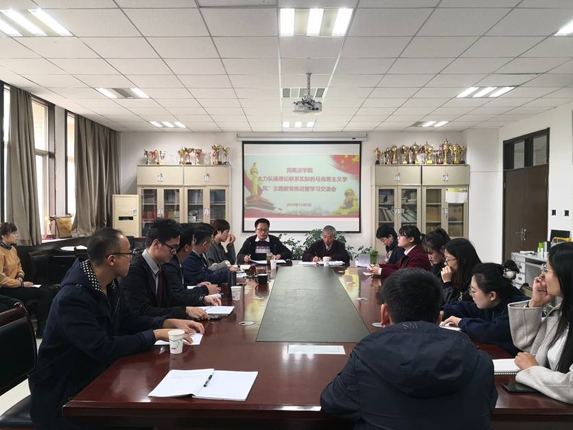 交流发言中,围绕“大力弘扬理论联系实际的马克思主义学风”这一主题,副院长程淑娟、亲属法教研室党支部书记马钰凤、团委书记李伟弟、本科生第四党支部书记丁艳艳,分别从“结合法学教师的初心使命”、“教学与实践相结合”、“学风建设”、“大学生思政工作”等方面交流了个人学习体会。学生代表张杏圃、杨海鹏、郭威、叶文轩表示,作为政法学生要积极参加实践,在实践中深化理论知识,践行理论联系实际的马克思主义学风,争做习近平新时代中国特色社会主义思想的忠诚实践者。