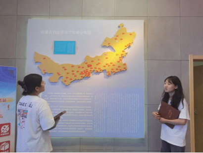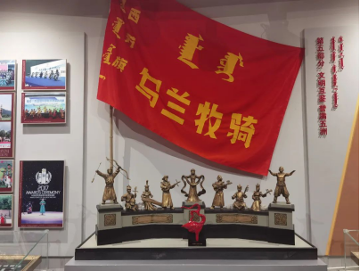 调研活动的第二站我们走进乌兰牧骑展馆,了解了这支一专多能的红色文艺轻骑兵在草原上的成长史。经过数十年的建设,苏尼特右旗乌兰牧骑已然从一支九人的队伍发展成为四十余人的团队,在草原上传播党的先进文化,丰富牧民生活的同时为牧民带去党的关怀。展馆中陈列的旧乐器、旧煤油灯、老式工具等老物件仿若带我们走近了曾经的那个年代。在艰苦卓绝的奋斗环境中,乌兰牧骑的队员们不仅要以各种文艺表演丰富牧民的生活,还要服务牧民,帮助牧民割草、剪羊毛,驾着马车为牧民带去先进的科学知识,传递党的先进文化。进入发展的新时期,乌兰牧骑演出不再局限于草原,通过展厅中的照片,我们了解到乌兰牧骑将民族文化带向祖国大江南北,带出国门,让先进文化在世界各地发出耀眼光芒。同时乌兰牧骑仍然扎根于牧区,数十年初心不变,为牧民们实现对美好生活的追求添砖加瓦。