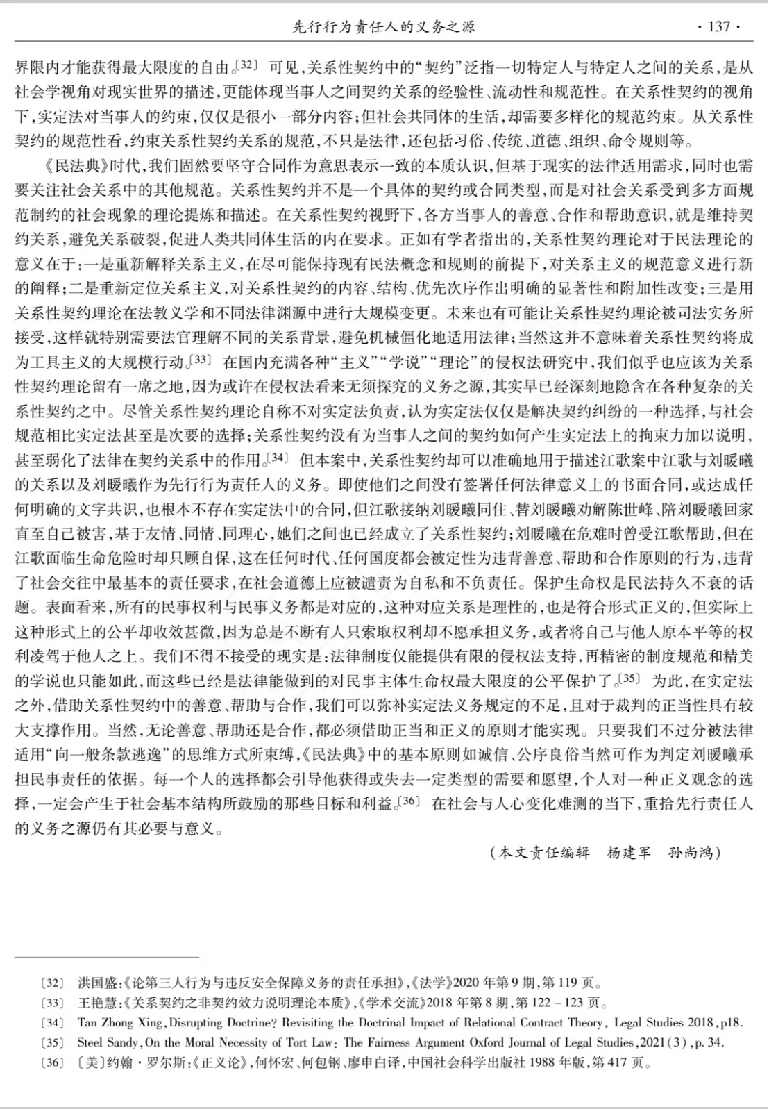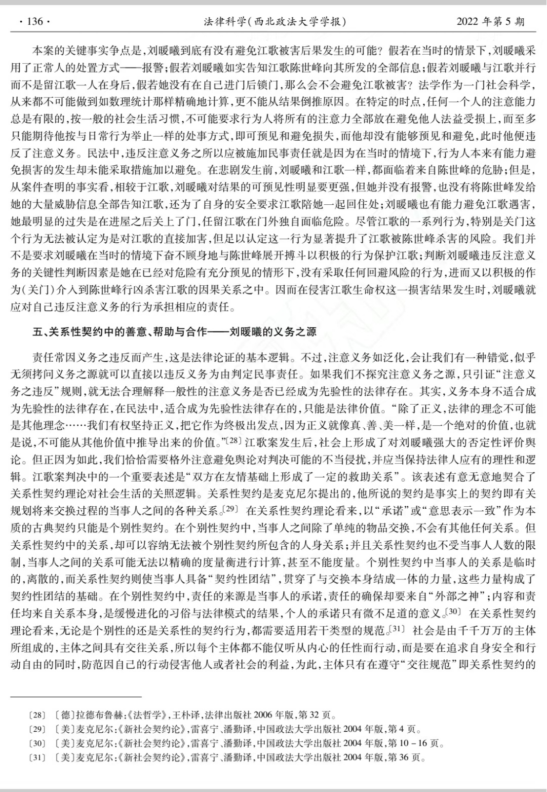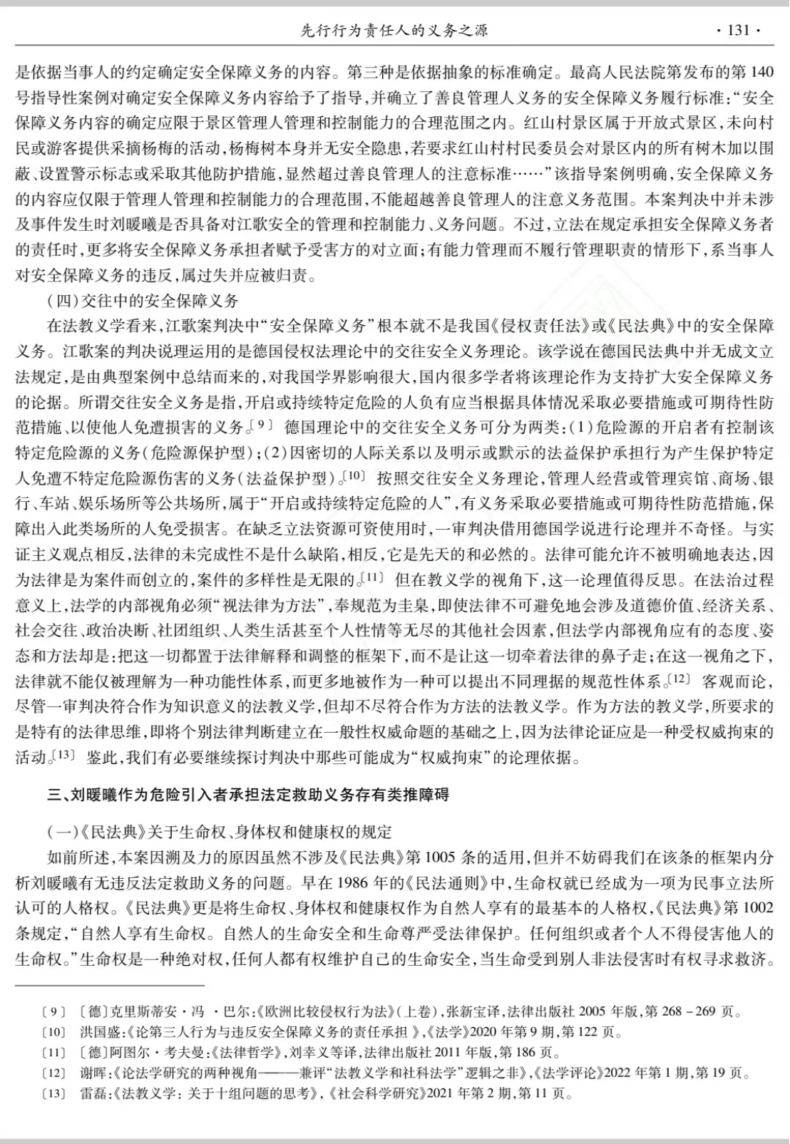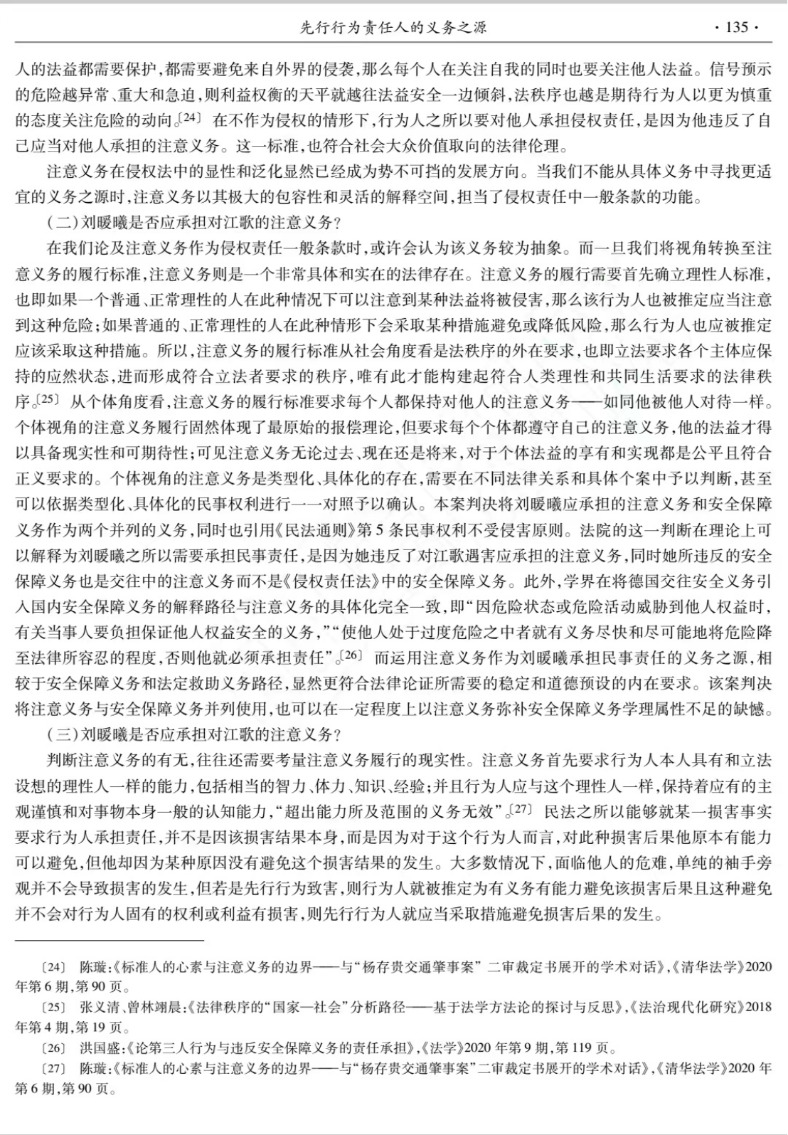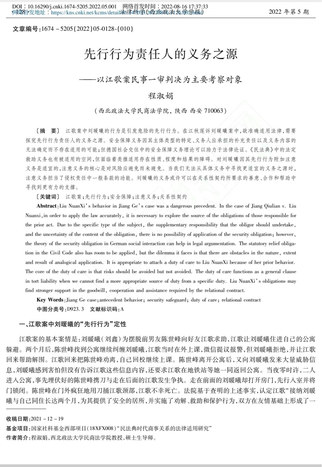 程淑娟老师的这篇论文发表于《法律科学》2022年第5期,以江歌案民事一审判决为主要考察对象介绍了先行行为责任人的义务之源。
