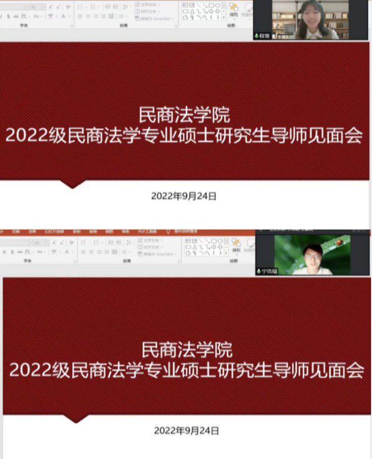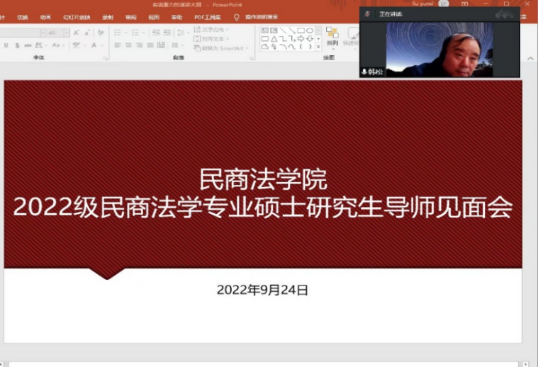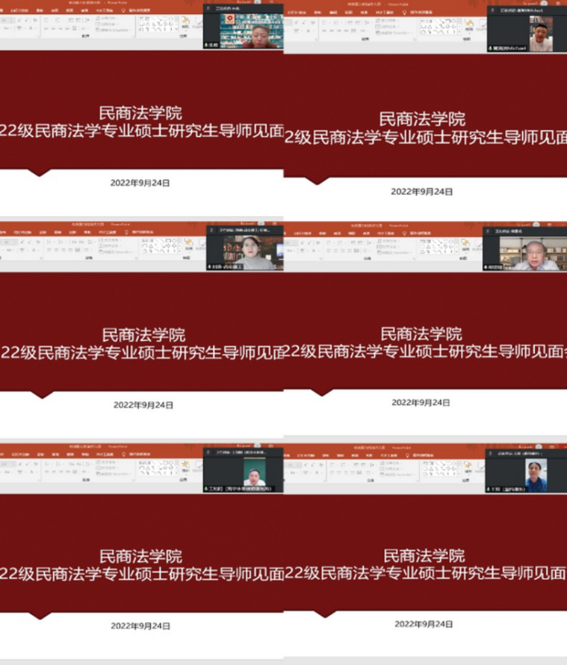 2022年9月24日晚,澳门威尼斯人官网 举行了2022级民商法学专业研究生导师(线上)见面会,院长兼导师组负责人程淑娟担任会议主持人,校内研究生导师韩松、王莹莹、车辉、孙玉红、李康宁、张晓飞、凤建军等和校外特聘教授兼实务导师致旭鹏、朱政、梁建明、王鑫、高宝红、陈皓、王毅、黄海洲、刘娟、王旭阳、蔡志保、王佩瑶等,以及全体2022级民商法学专业研究生新生参与了此次会议。